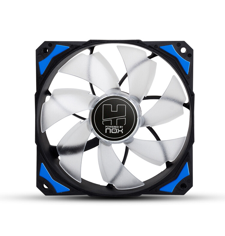 NOX H-Fan LED. Adequado para: Pasta de computador, Modelo: Ventoinha, Diâmetro do ventilador: 12 cm. Cor da caixa: Preto, Azul, Branco, Iluminação: LED, Cor de iluminação: Azul. Corrente nominal de linha: 0,14 A, Consumo de energia: 0,168 W, Alimentação: 3 W. Peso do produto: 130 g, Dimensões da ventoinha (L x P x A): 120 x 120 x 25 mm. Tipo de esfriamento: Hydraulic