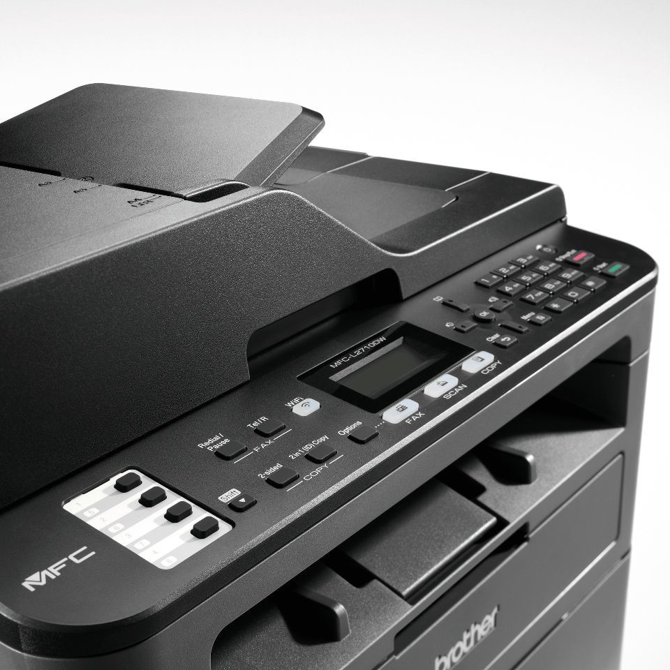 Brother MFC-L2710DW. Tecnologia de impressão: Laser, Impressão: Mono printing. Resolução Máxima: 1200 x 1200 DPI. Cópia: Mono. Resolução de cópia máxima: 600 x 600 DPI. Digitalização: Digitalização a cores. Resolução óptica de digitalização: 600 x 600 DPI. Envio de fax: Mono, Funções duplex: Impressão. Dimensão máxima de papel ISO A-series: A4. Capacidade standard de entrada (folhas): 250 folhas. Capacidade standard de saída (folhas): 120 folhas. Wi-Fi. Cor da caixa: Preto, Cinzento.